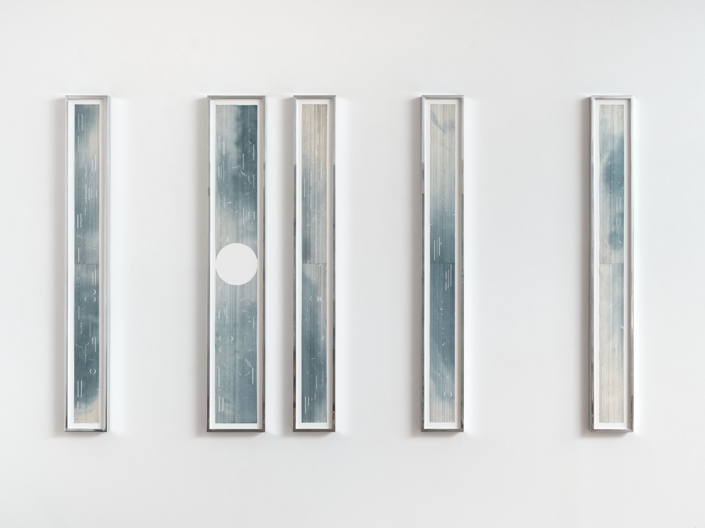 graphite on hand-cut, color ottchil painted hanji, aluminum frame, 5 parts