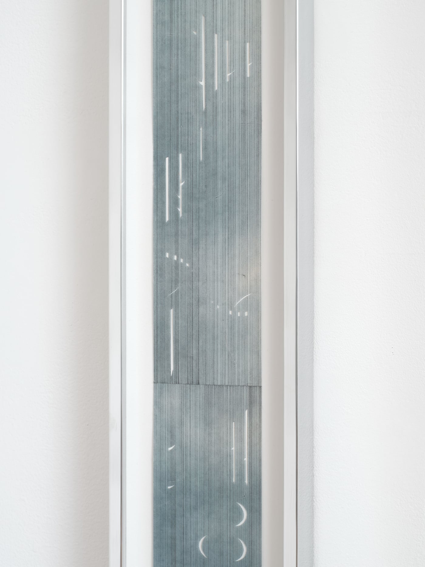 Graphite on handcut ottchil dyed hanji, walnut frame, 111.5 x 22.5 x 5 cm